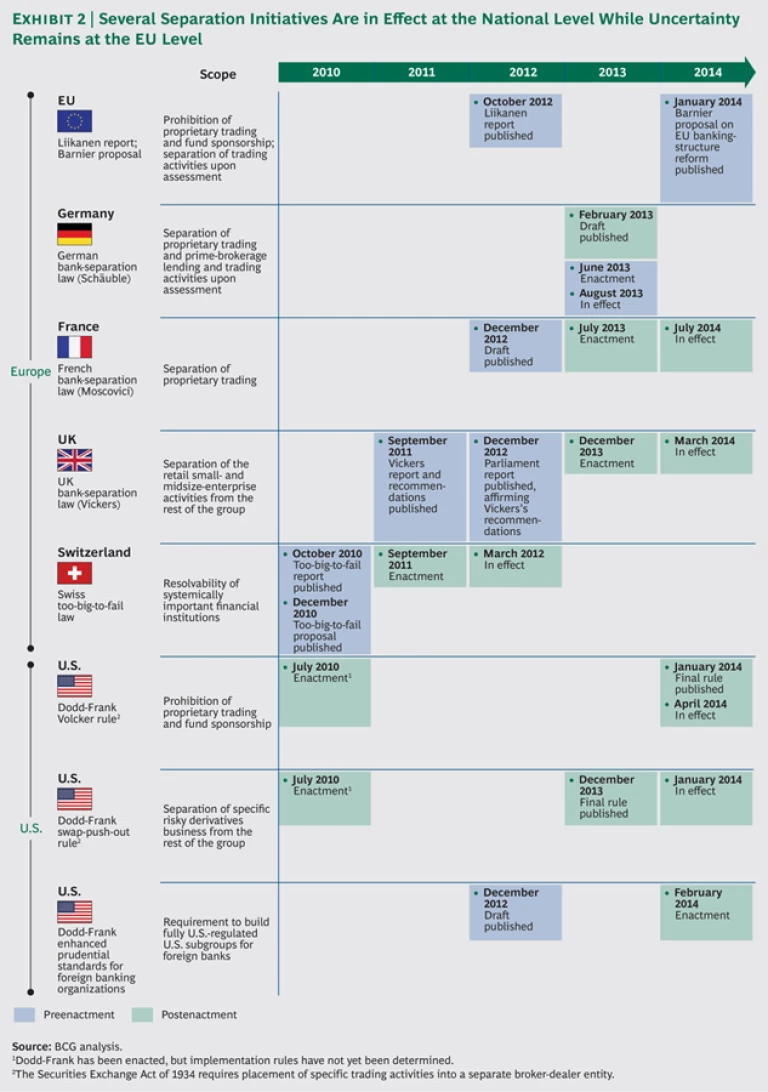 As a consequence, the discussion of structural bank reforms as a means of reducing complexity and protecting the economy is a growing priority. On the national level, an array of initiatives has already come into effect, with the U.S., the UK, and Switzerland being the most advanced. (See Exhibit 2.)