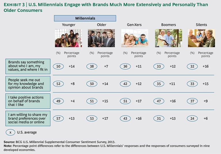 Inspiring Millennials to Make Brand Referrals. Engaging U.S. Millennials after a purchase is not only critical to keeping them as customers; it is important also because Millennials are more eager than other generations to share their opinions with friends and on social networks. More than half of U.S. Millennials said that people seek them out for their knowledge and opinions of brands, compared with only 35 percent of boomers. More Millennial males than females said that they think that they are sought out for their brand and purchase opinions. In fact, Millennials said that they believe that they influence the brand and purchase decisions of around four family members and friends. Boomers, by comparison, say that they influence around two. That means Millennials can become especially powerful cross-generational advocates of brands—as well as influential critics. A company’s capabilities in promoting advocacy and social media, therefore, are increasingly important.