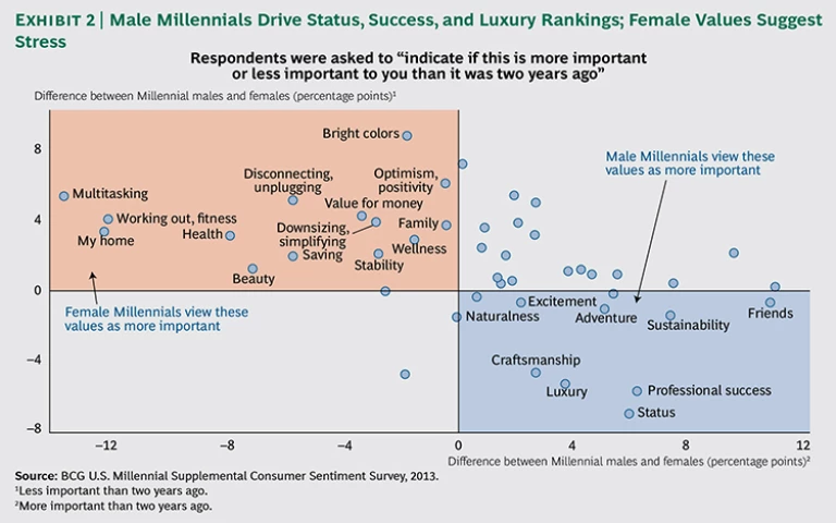 Our survey found that both Millennial men and women focus on themselves. They differ, however, in their emphasis on specific values. Male Millennials attach a greater importance to external recognition, citing values such as status, professional success, luxury, and craftsmanship.