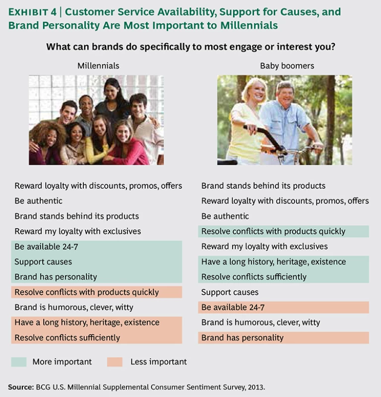 Millennials were asked to name the most important things brands can do to “engage and interest” them: their top two responses were to reward their loyalty with discounts and promotions and to “be authentic.” These were also high on the lists of Gen-Xers and boomers. But more Millennials than other generations also listed being available, supporting causes, and having a brand personality. (See Exhibit 4.)