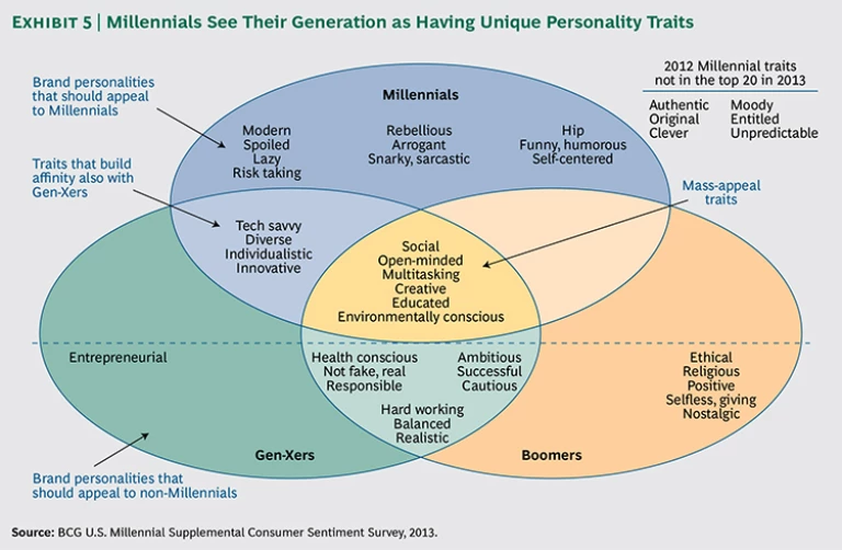 Do all three generations share any common ground? Mass traits that appeal most to Millennials as well as Gen-Xers and boomers include social, open-minded, multitasking, creative, and environmentally conscious. Millennial traits that should also build affiliation with Gen-Xers are diverse, individualistic, and innovative. (See Exhibit 5.) In our 2012 survey, Millennials also cited authentic, original, and clever.