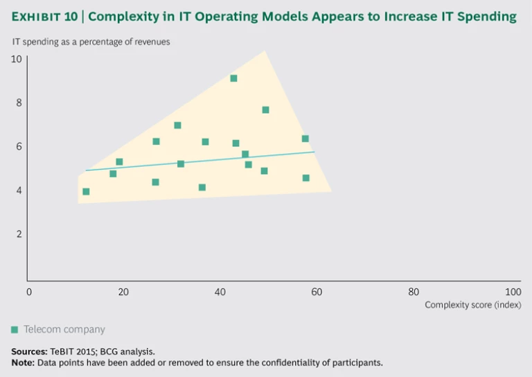 The TeBIT data also confirmed an important finding from last year, the first time the TeBIT benchmark examined in depth the relationship between complexity and costs. Overall, complexity in a company’s IT operating model seems to significantly influence IT spending. (See Exhibit 10.) But once again, when we looked at individual complexity levers, the link was more nuanced—something telcos should keep in mind as they adjust their models going forward.