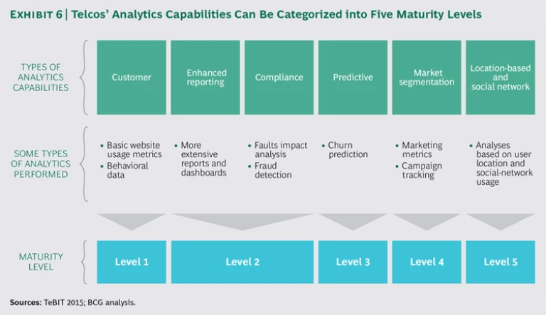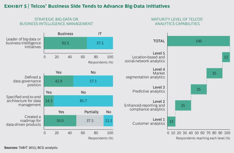 Although digital initiatives may not be seeing as much business-side involvement as perhaps they should, the story is different for another hot industry topic: big data. Indeed, TeBIT 2015 revealed that for nearly two-thirds of participants—62.5 percent—big-data initiatives are led by the business side rather than IT. The survey also showed that more than half of the participating telcos have reached at least a midlevel of maturity in their analytics capabilities. (See Exhibit 5.) The influential and apparently beneficial role the business side has played in big data may be a blueprint—and present an opportunity—for advancing digital initiatives, as well.