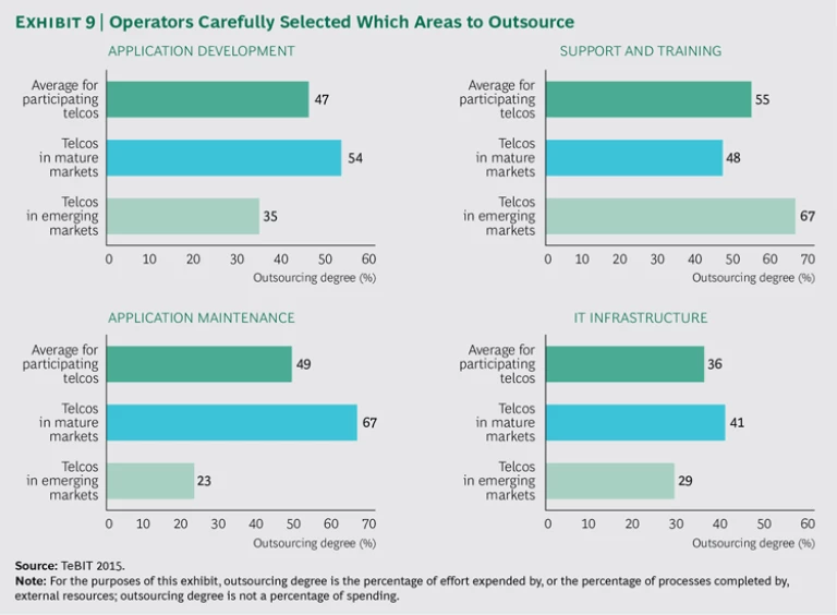 This year, these trends continued. Application development and maintenance, for example, had a higher degree of outsourcing than IT infrastructure. (See Exhibit 9.) Moreover, TeBIT 2015 revealed that telcos are devoting a smaller share of their IT budgets to outsourcing than they have in the past: on average, telcos allocated only 15 percent of total spending to outsourcing, compared with 23 percent and 26 percent in TeBIT 2014 and TeBIT 2013, respectively. This lends weight to the notion that operators are continuing to use outsourcing in a more selective and more efficient manner—and as a result, outsourcing is becoming more effective. The cost payoff we are finally seeing, then, is likely here to stay.
