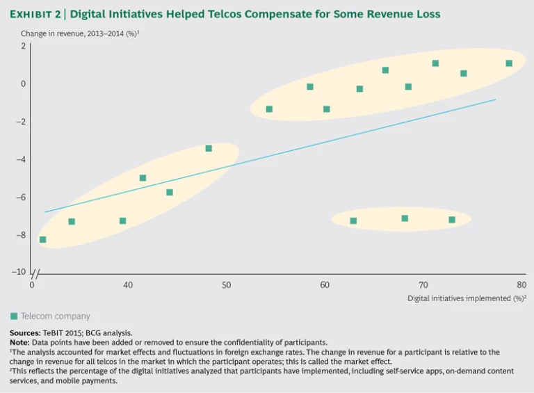 TeBIT 2015 found that telcos are beginning to reap tangible benefits from digital initiatives. We saw a clear correlation between the breadth of digital initiatives a telco has implemented and the improvements in its revenues. (See Exhibit 2.) In general, the telcos that are most actively pursuing digital initiatives are performing best. But the question is this: Could they further improve performance?