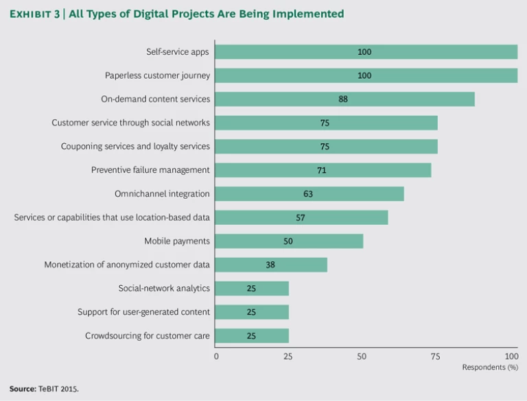 Telcos need to understand how to make adjustments. At the top of the list should be digital initiatives. TeBIT 2015 showed that these pay off; they can help participants compensate for some declines in revenues. The survey also showed that e-sales and e-services—which by their nature help reduce manual effort—are beginning to gain traction and, in the process, are starting to reshape how telcos sell to and support their customers.