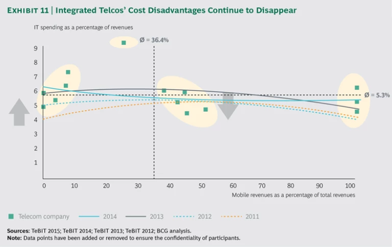 Finally, TeBIT 2015 found integrated providers continuing to reduce their cost disadvantages. In the past, these players had typically seen their IT spending account for a higher percentage of revenues than fixed- or mobile-only providers. But the gap is closing. (See Exhibit 11.) And as integrated providers continue to consolidate their fixed and mobile IT onto a single platform and replace legacy systems, this trend should continue.