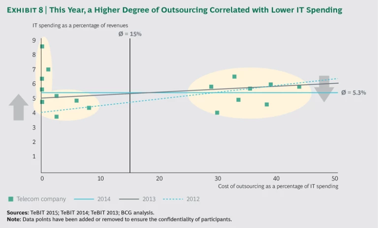 This year was different. TeBIT 2015 found that a higher degree of outsourcing correlated with lower IT spending. (See Exhibit 8.) As a means of lowering costs, outsourcing—at long last—is paying off.