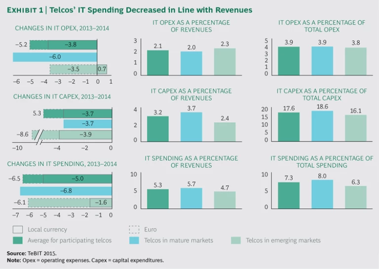 Although the news about digital initiatives was welcome, the finding of another trend was not: a decline in revenues—experienced by the majority of TeBIT participants—hampered their ability to invest. From 2013 through 2014, IT capital expenditures (capex) declined by 3.7 percent, on average, after fluctuations in exchange rates were accounted for. Telcos in mature markets saw the same drop (3.7 percent), while those in emerging markets saw IT capex fall 3.9 percent. (See Exhibit 1.) The irony, of course, is that a revenue decline is often best attacked through increased investment, because it can fund the differentiation and innovation that creates competitive advantage—and growth.