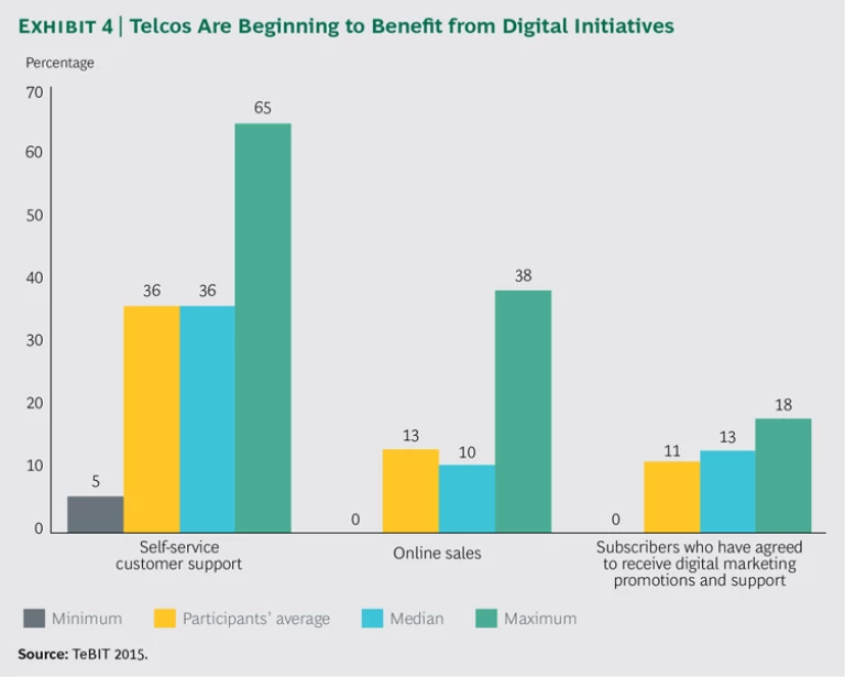 For telcos, these are still early days. Among participants, the TeBIT survey found that, on average, 36 percent of customer support is self-service, 13 percent of sales are online, and only 11 percent of customers have agreed to receive digital marketing promotions. (See Exhibit 4.) The bulk of these activities continue to take place the old-fashioned way, through traditional channels. As telcos ramp up their digital efforts—and digital’s role in their business—they may want to think not only bigger but also more strategically and more holistically, making digital initiatives a collaborative, company-wide focus. That may mean more radical changes for the business, but it may also bring more dramatic changes in revenues.