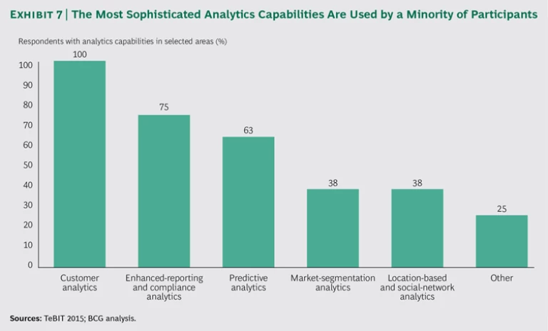 Despite telcos’ increasing adoption of analytics, the TeBIT data did not show operators gravitating toward a particular analytics software vendor. The majority of telcos are using commercial off-the-shelf (COTS) solutions for analytics, with Google Analytics, IBM SPSS Statistics, Oracle BI, and SAS Business Intelligence and Analytics all broadly deployed. Significantly, these are all relatively traditional analytics tools, though some have been upgraded to include big-data functionality. Newer software that has been developed specifically for big data (and used with great success by many Internet start-ups) is rarely used in the telecom industry—and TeBIT 2015 found no evidence that this is changing.