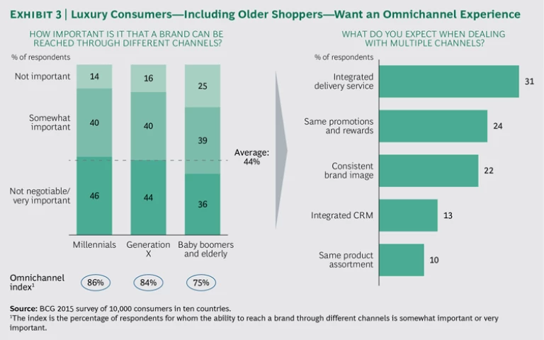 At the same time, consumers are ready for omnichannel interactions with luxury brands; our research indicates that fully 80% of consumers actively expect this. (See Exhibit 3.) Omnichannel does not just mean the option of shopping online rather than in stores, even though e-commerce is indeed surging in most luxury sectors in many countries. Rather, it means a customer experience that is seamlessly integrated across all touch points. Shoppers want integrated delivery service (31% of those surveyed), the same promotions and rewards regardless of channel (24%), and a consistent brand image (22%), among other factors.
