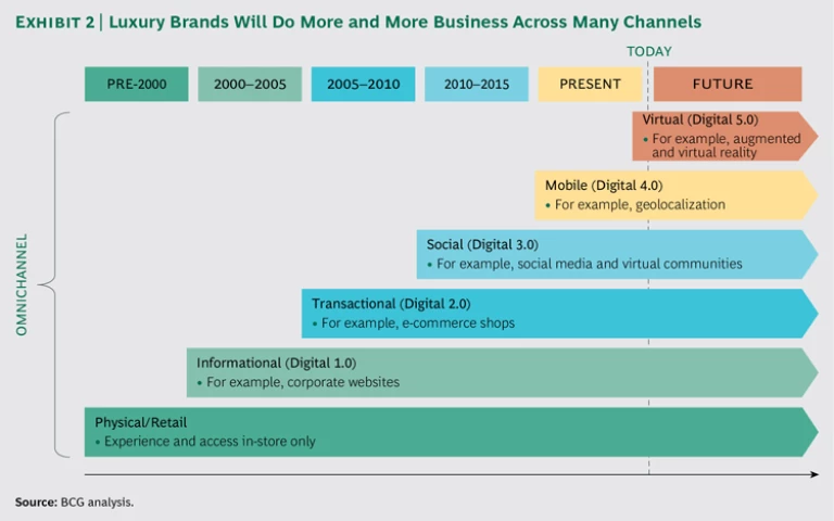 Luxury consumers have especially high expectations, and brands that fail to keep up with what consumers want now will quickly lose competitive advantage. Their leaders must understand how digital is changing their markets. Gone are the days when luxury revolved around traditional marketing and face-to-face interactions exclusively at the store. (See Exhibit 2.) Not only does the business of luxury now include e-commerce and social media, but it requires brands’ executive teams to ensure much more integration across a brand’s once-separate departments.