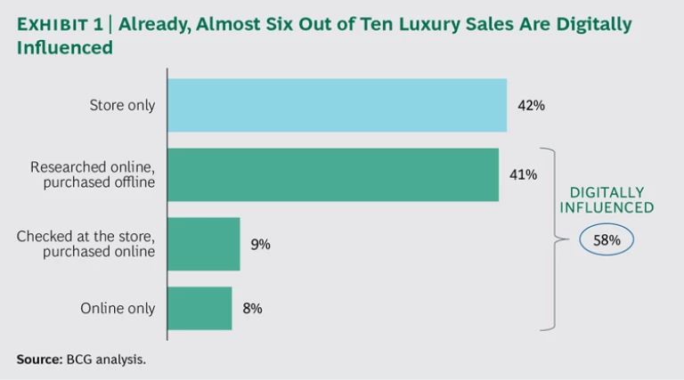 The fact is, digital is an inevitable, inescapable business shift. New research from BCG indicates that already today, almost six out of ten luxury sales are digitally influenced. (See Exhibit 1.) The research (a survey of approximately 10,000 consumers in ten countries plus interviews with industry leaders) also found that online commerce, which now accounts for 7% of the global personal-luxury market, will grow further to make up 12% of that market by 2020.