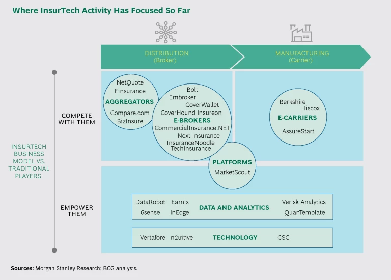 Today, the bulk of the activity among insurtechs (as these mostly new, venture-capital-backed companies are called) is in the e-broker space. E-brokers offer platforms that shed light on the insurance options available to small businesses. Some insurtechs are setting out to be aggregators (essentially, providers of comparison tools, a model that is not easy to pull off in commercial insurance), while others are positioning themselves as insurance carriers or managing general underwriters whose marketing and points of contact with small-business customers are overwhelmingly digital. A final category in the insurtech startup space: data analytics or technology companies that aim to empower existing players in their digital transformation rather than competing with them. (See the exhibit below.)