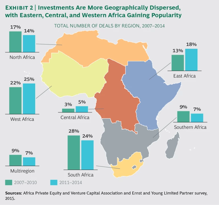 - Geography. Investors are diversifying geographically as well. From 2007 through 2010, 28% of deals were in South Africa. That dropped to 24% from 2011 through 2014. The portion of deals done in West, Central, and East Africa, meanwhile, rose from 38% to 48% over those two time periods. (See Exhibit 2.) In terms of value, South Africa’s share of African deals dropped to 15% on average from 2010 to 2015, according to AVCA, while East, Central, and West Africa captured 33% of total investment. Seventy percent of limited partners—the investors in private equity funds—surveyed by AVCA cited West Africa as the most attractive region for investment over the next few years.