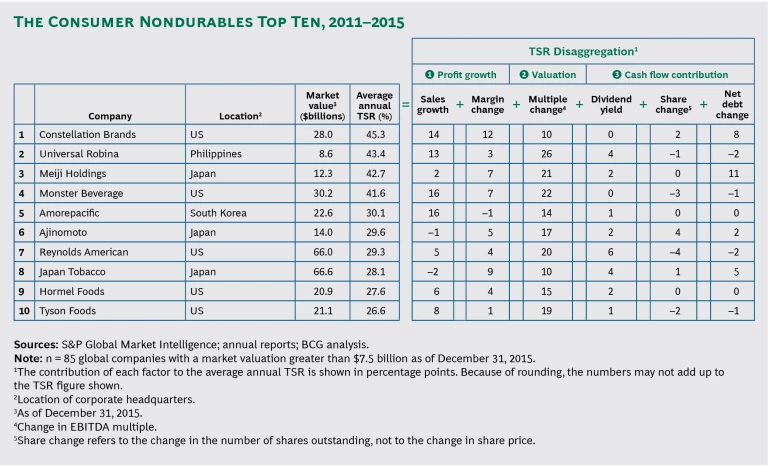 In 2016, The Boston Consulting Group conducted its annual analysis of the total shareholder return (TSR) of nearly 1,620 publicly traded companies in 28 industries. Eighty-five of the companies were in nondurables. (See Creating Value Through Active Portfolio Management, the 2016 BCG Value Creators report, October 2016.)