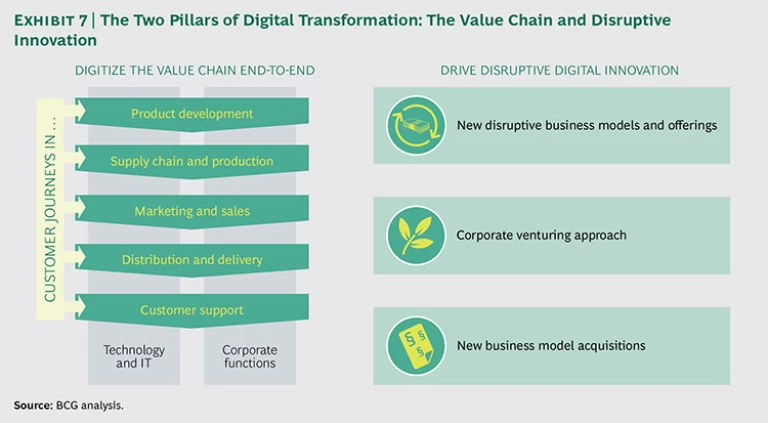The best way for a company to do this is to engage in an end-to-end digital transformation of its value chain while creating new and disruptive digital businesses. (See Exhibit 7.) The end-to-end digital transformation will generate greater productivity and growth from the existing organization, and digital disruption will create fresh growth. Both paths themselves will require the use of advanced digital tools.