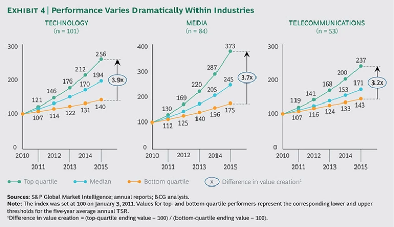 Medians and averages, of course, mask individual performance. Most companies cannot realistically aspire to become an Apple or a Tencent, both of which had remarkable runs, making the TMT top ten seven and five years in a row, respectively. (See Exhibit 3.) But most should strive to be top-quartile TSR performers in their industry. As Exhibit 4 shows, the weakest company in the top quartile generated returns more than three times those of the strongest bottom-quartile company. A $100 investment in that bottom-quartile technology company, for example, would have grown to $140, compared with $256 for the top-quartile company.