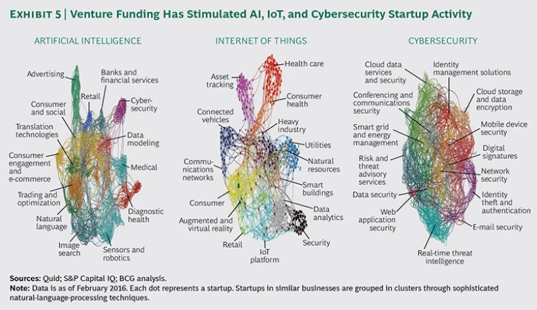 In this report, we shine a light on three trends: artificial intelligence (AI), the Internet of Things (IoT), and cybersecurity. Although these trends have not yet figured prominently in past value creation strategies, they are all active targets of venture funding and will undoubtedly shape future performance. (Exhibit 5 shows the specific areas within AI, IoT, and cybersecurity that have been receiving the most venture funding.)