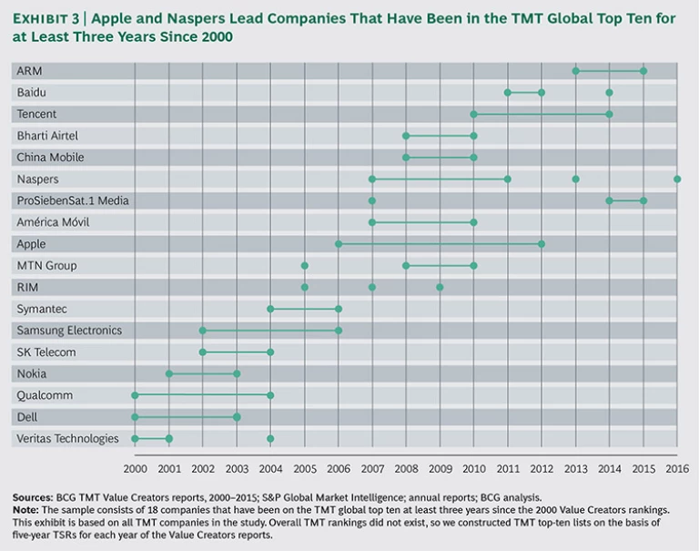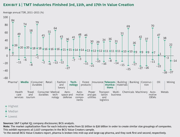 In our study of total shareholder return (TSR), we cover a five-year period—2011 through 2015—to identify, among the 238 companies analyzed, the winners over the medium term. We also examine how the three TMT industries fared across the 27 industries in the overall BCG Value Creators report. (See Exhibit 1.)
