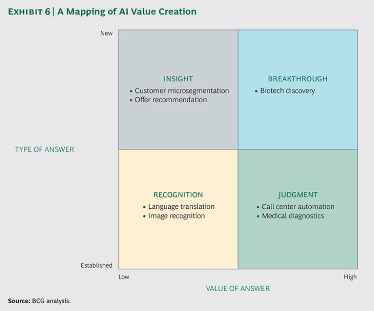 The field of AI is broad, so it helps frame where and how machines can improve performance. Along one dimension, AI can derive low-value answers (identifying a cat, for example, through basic image recognition) or high-value answers (diagnosing a stress fracture, for example, by reading a CAT scan). Along another dimension, it can generate either known answers more swiftly than humans or “unknown” answers. Humans, for example, cannot easily process hundreds of thousands of retail sales to generate insight. Plotting these two dimensions reveals clusters of business challenges and opportunities of varying degrees of sophistication and insight. (See Exhibit 6.)