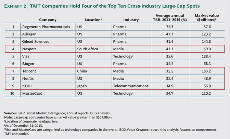 Compared with the 2010–2014 period, when stocks were coming off the bottoms of the Great Recession, the TSR of all three industries was slightly lower, but the decrease was smaller than the 2.8 percentage point drop in median TSR for all companies in all industries. Low interest rates and lack of alternative investments undoubtedly helped overall equity performance. Even so, the largest TMT companies continued to excel, with four TMT companies, three of them disruptors, making the
