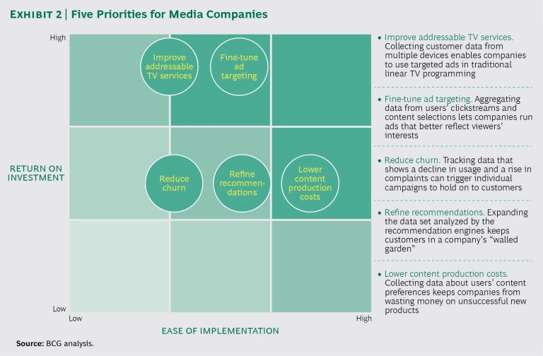 Data. A media company’s decision about where to begin should reflect input from its business and content leaders. These leaders should create a list of priorities that is based on return on investment and ease of implementation. Although the priorities for any given company will differ depending on the opportunities and the threats it is facing, many media companies can use data to improve addressable TV services, fine-tune ad targeting, reduce churn, refine recommendations, and lower content production costs. (See Exhibit 2.)