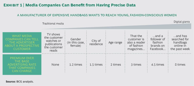 The pinpoint accuracy of such information occasionally prompts a backlash on the part of consumers. (See “Bridging the Trust Gap: The Hidden Landmine in Big Data,” BCG article, June 2016.) But there is no question that it increases media’s overall effectiveness. According to BCG analysis, media companies can charge advertising rates that are 1.5 times the base rate when gender and location of a customer are known—and potentially many times that level if that customer’s precise intention is clear. (See Exhibit 1.)