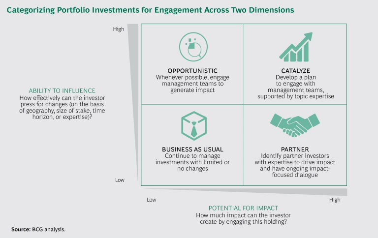 Categorize portfolio holdings. To determine which companies and assets are the best candidates for engagement, investors should rank them along two dimensions: investors’ ability to influence management to make changes, and the potential impact of such changes. (See the exhibit.)