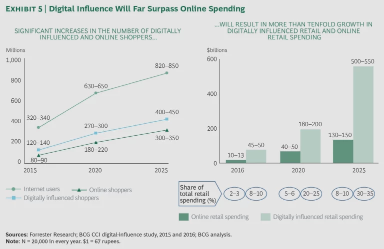 Online spending is taking off. In the past three years, the number of online buyers has increased sevenfold to 80 million to 90 million. Continued growth in internet penetration and rising e-commerce adoption will drive further growth in the number of online buyers. Multiple factors are behind the rising adoption of e-commerce channels. These include the strong value proposition offered by online merchants, proliferating payment platforms, strengthening delivery logistics, and significant financial investment in the sector. On the basis of these and other factors, we anticipate that the number of online buyers in India will climb to 300 million to 350 million by 2025. In terms of value, online commerce is still a small portion of total retail sales, but it is growing fast. With the increase in online buyers, we expect the total value of e-retail to reach $130 billion to $150 billion, or 8% to 10% of total sales, by 2025. (See Exhibit 5.)