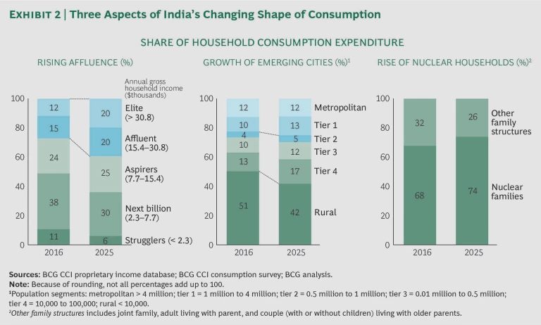 Companies today need to focus on three aspects of India’s fast-growing consumer market: rising affluence, the country’s continuing and unique pattern of urbanization, and fundamental shifts in family structures. (See Exhibit 2.)
