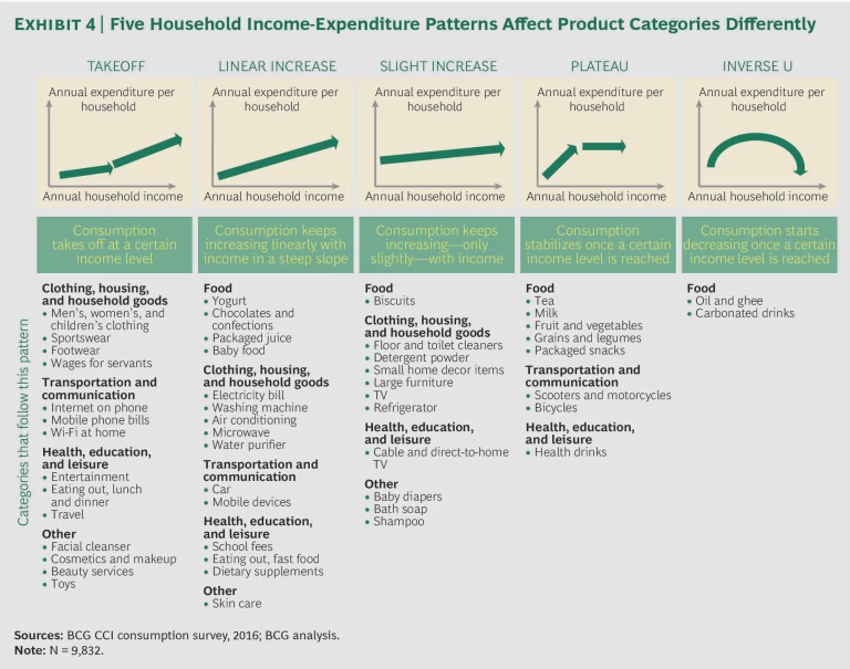 Rising incomes affect spending patterns in various categories differently. Certain categories (and subcategories) become more or less relevant to consumers as their incomes increase. The BCG CCI’s most recent consumer survey in India studied consumption in more than 50 categories that fall into three broad purchase groups: high-frequency items (such as food and beverages, personal-care products, entertainment, and telecom products and services), medium-frequency items (apparel, home furnishings, and tourism, for example), and low-frequency items (such as consumer durables, cars, and appliances). We have found that the classic S-curve growth pattern does not always hold true and that different categories exhibit very different growth trajectories. The study revealed five broad categories of correlations between rising income levels and expenditures. (See Exhibit 4.) The categories reflect the following consumption-income relationships: