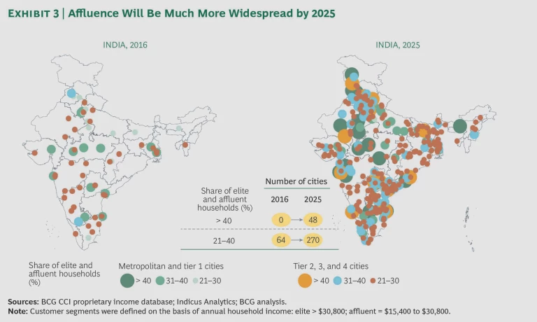 Rising Affluence. We observed in 2012 that India’s income pyramid was transforming itself into a diamond as household incomes grew. In terms of spending, the two top consumer categories—elite and affluent—will become the largest combined segment by 2025, accounting for 40% of consumption compared with 27% in 2016. Within this segment, the urban elite and affluent are fueling most of the growth. By 2025, wealthy urbanites will be responsible for one-third of total consumption. The share of the next billion and strugglers will shrink from 49% in 2016 to 36% in 2025.