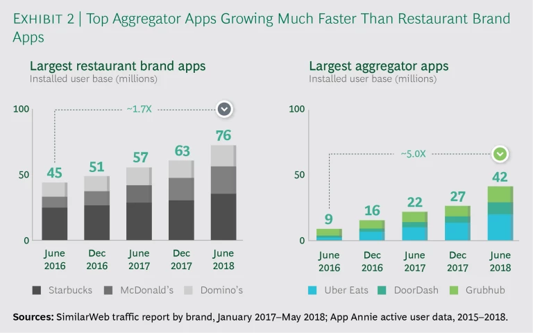 Aggregators continue to make inroads. From June 2016 to June 2018, restaurant delivery mobile app sessions increased by almost 400%, with the biggest increases accruing to aggregators. (See Exhibit 2.)