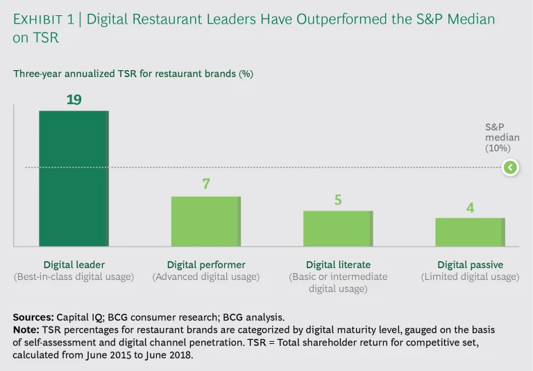 This is a big opportunity for the brands that move fast. We’ve seen data and analytics programs yield 5% to 10% increases in revenue, 10% to 15% reductions in store-level operating costs, and 10% to 20% improvements in EBITDA. An even more significant development: digital leaders’ total shareholder return over the past three years has outpaced that of other restaurants by 12 percentage points and has almost doubled that of the S&P 500. (See Exhibit 1.)