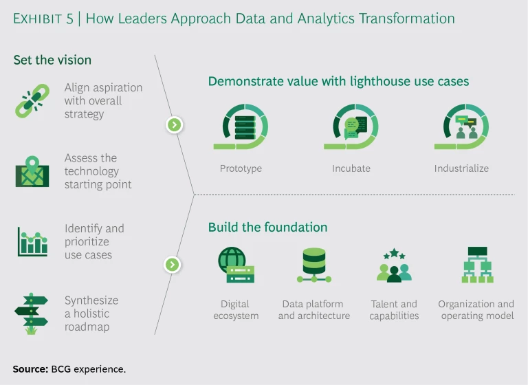 The sheer volume and variety of potential use cases can be as much a problem as an opportunity. Absent a vision of what they want to achieve, companies may find themselves blinded by the possibilities that the “transformational” new tools offer. Leaders, on the other hand, take a strategic and comprehensive approach, setting the vision for where they want to go and then designing the journey to include steps to generate early successes, provide funding, and show the way to the rest of the organization. (See Exhibit 5.)