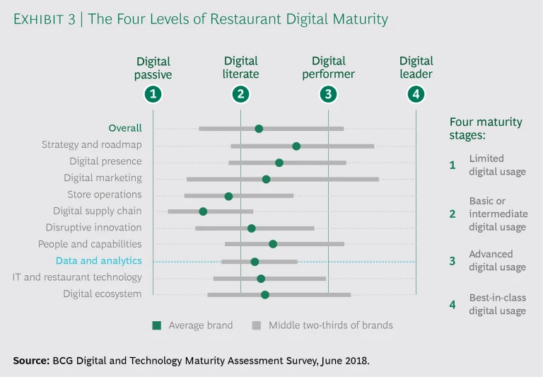 BCG’s 2018 digital maturity survey of top restaurant brands found that four in five brands can access a wealth of data from multiple sources, but only one in five has in place a comprehensive big data strategy, an integrated customer master data set that the entire organization can access, or the ability to use predictive analytics algorithms to drive business decisions automatically. Not a single brand self-identified as fluent in advanced analytics techniques such as artificial intelligence, machine learning, chatbots, or voice-enabled ordering.