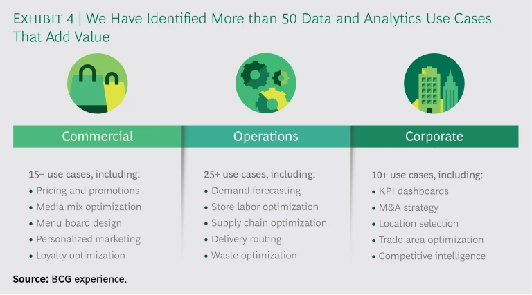 Leaders that use data to fundamentally change the ways in which they work generally begin with a use-case-centric approach. In our work with leading brands, we have identified more than 50 data and analytics use cases that can add value. (See Exhibit 4.)