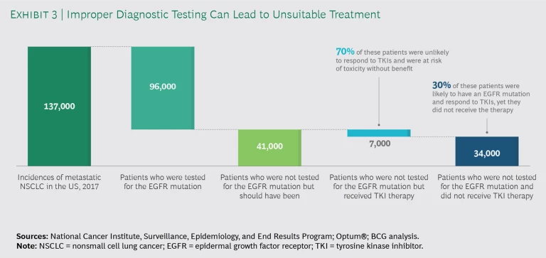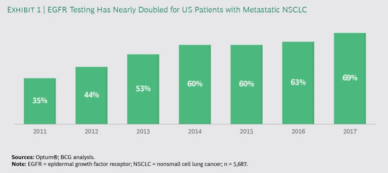 To show the power of this approach, BCG recently partnered with AdvaMedDx, an industry association of medical diagnostics companies, to examine the barriers to adoption for potentially lifesaving diagnostic tests. The team agreed to use the adoption of epidermal growth factor receptor (EGFR) diagnostics among patients with metastatic nonsmall cell lung cancer (NSCLC) as the test case, and BCG evaluated a broad sampling of US patients.