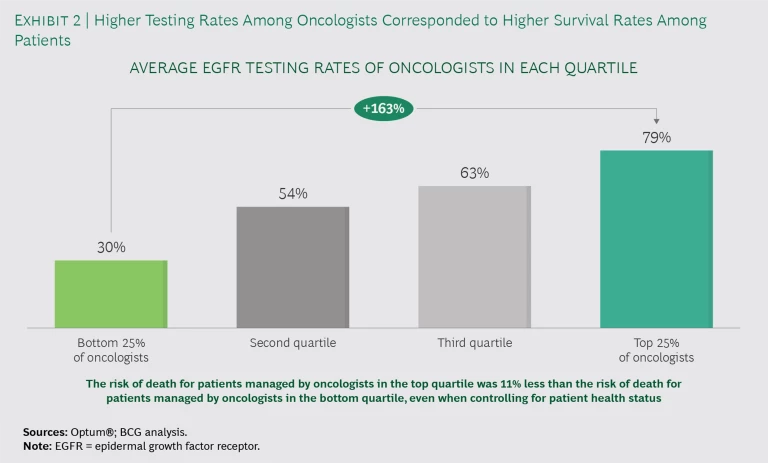 Variations in testing rates correspond to changes in survival rates. We segmented oncologists into quartiles on the basis of their EGFR testing rates. (See Exhibit 2.) The oncologists in the top quartile were more than twice as likely to order the EGFR test as those in the bottom quartile. Even after adjusting for patient factors, patients treated by top-quartile oncologists saw an 11% decrease in mortality rate, compared with patients treated by bottom-quartile oncologists.