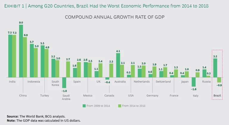 Even when compared with other developing markets, Brazil’s economic environment remains challenging for companies. From 2009 through 2013, the country rebounded strongly from the global financial crisis, only to hit an additional set of problems that were more localized. Several financial challenges led to the biggest one-year decline in GDP in a hundred years. From 2014 to 2018, Brazil posted the worst economic performance of any G20 country. (See Exhibit 1.) The depression was particularly severe, with a steep drop in retail sales, increased corporate leverage, and high unemployment.