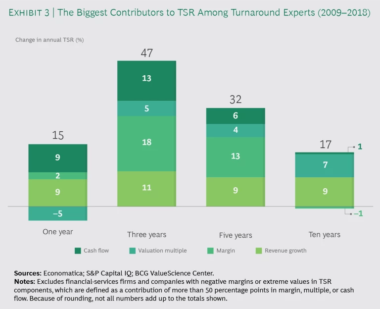 One other aspect of the TSR analysis worth noting is that the key contributors to strong performance for turnaround experts change over time. (See Exhibit 3.) In the short term, changes to cash flow can have a disproportionate effect upon TSR; margin improvements are the biggest contributor in the medium term (within the three-year and five-year marks); and increased revenue and multiples produce long-term, sustainable TSR over ten years.