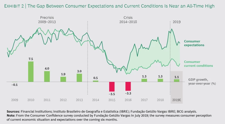 Since the beginning of 2017, however, the country’s economy has bottomed out and begun to recover—but only slightly. Brazil’s per-capita GDP remains roughly at 2012 levels, resulting in stagnated living standards (in sharp contrast with those of other developing economies). Furthermore, current projections indicate that the country’s GDP won’t return to prerecession levels for at least another four years—a far longer recovery period than most had anticipated. And although consumers’ current financial situations are unstable, there is a huge gap between consumers’ expectations and current consumer conditions. (See Exhibit 2.)