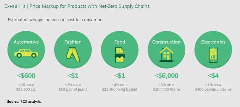 How can this be? As an example, consider the steel that goes into a midsize family car with a $35,000 sticker price. Producing steel is one of the most emissions-intensive activities in the supply chain. Producing zero-carbon steel can increase the steel makers’ costs significantly—by as much as 50% in some cases. But since steel accounts for only roughly $1,000 of total car costs, the markup on this final product will be much, much lower. In fact, the same car made with exclusively zero-carbon materials would cost only about $600 more—or roughly a difference of 2%. Considering that getting there will take even the most ambitious companies many years, the immediate economics look much less scary. (See Exhibit 3.)
