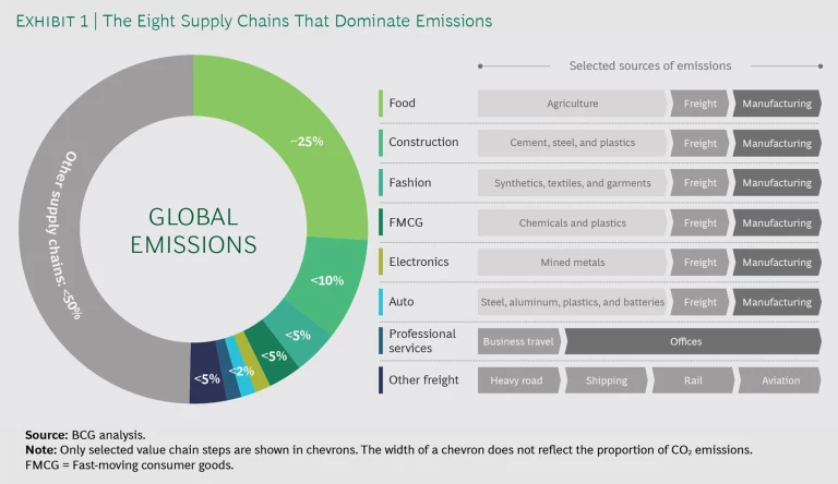 The global supply chain carbon footprint is substantial. Eight global supply chains account for more than 50% of annual greenhouse gas emissions. Only a small proportion of these emissions are produced during final manufacturing. Most are embedded in the supply chain—in base materials, agriculture, and the freight transport needed to move goods around the world. (See Exhibit 1.)