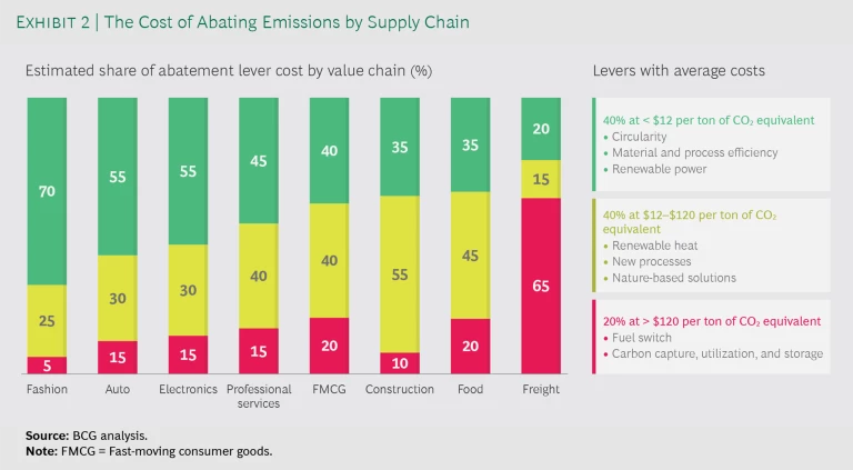 For producers of many of these materials, as well as for freight transport players, ambitious decarbonization is extremely challenging. Many supply chain emission reduction measures are comparatively expensive. Partners often operate in markets that are commoditized, with slim margins and limited opportunities for differentiation. Across a whole value chain, however, emissions may be addressed more affordably. In most supply chains, there is the potential for substantially more efficiency and for much greater reuse of materials. (See Exhibit 2.) In addition, a large share of emissions comes from traditional power, which can be replaced relatively cheaply with renewables.