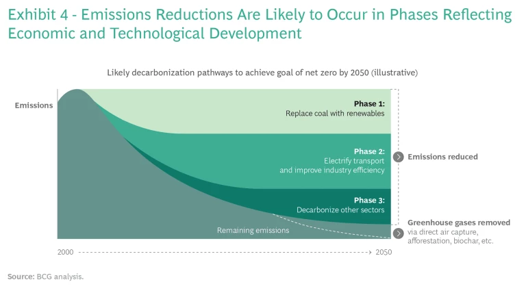 When planning for decarbonization, companies should avoid focusing too early on the long list of micro-uncertainties in the path ahead, as doing so risks derailing climate strategy. The big picture is both more important and more predictable than the individual pixels. It’s impossible to predict the exact timing of things, of course, but the sequence and rough orders of magnitude are pretty clear: physics, chemistry, and economics dictate the high-level path, and the degrees of freedom at the macro level are limited. The degree of difficulty—due either to the complexity of the problems or to the maturity of the critical technologies—defines three broad phases of emissions reduction. (See Exhibit 4.)