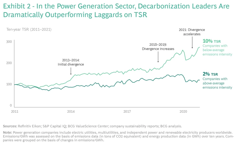 In 2014, we began to see a divergence between the total shareholder returns (TSRs) of companies in the power generation sector that had achieved below-average emissions intensity and those of their above-average rivals. In 2018, that gap began to widen significantly. (See Exhibit 2.)