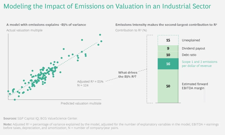 Recent BCG analysis in one industrial sector found a clear link between lower carbon intensity and higher valuations among a peer set of companies with comparable product portfolios but different carbon footprints. (See “Exploring the Relationship Between Carbon Intensity and Valuation.”)